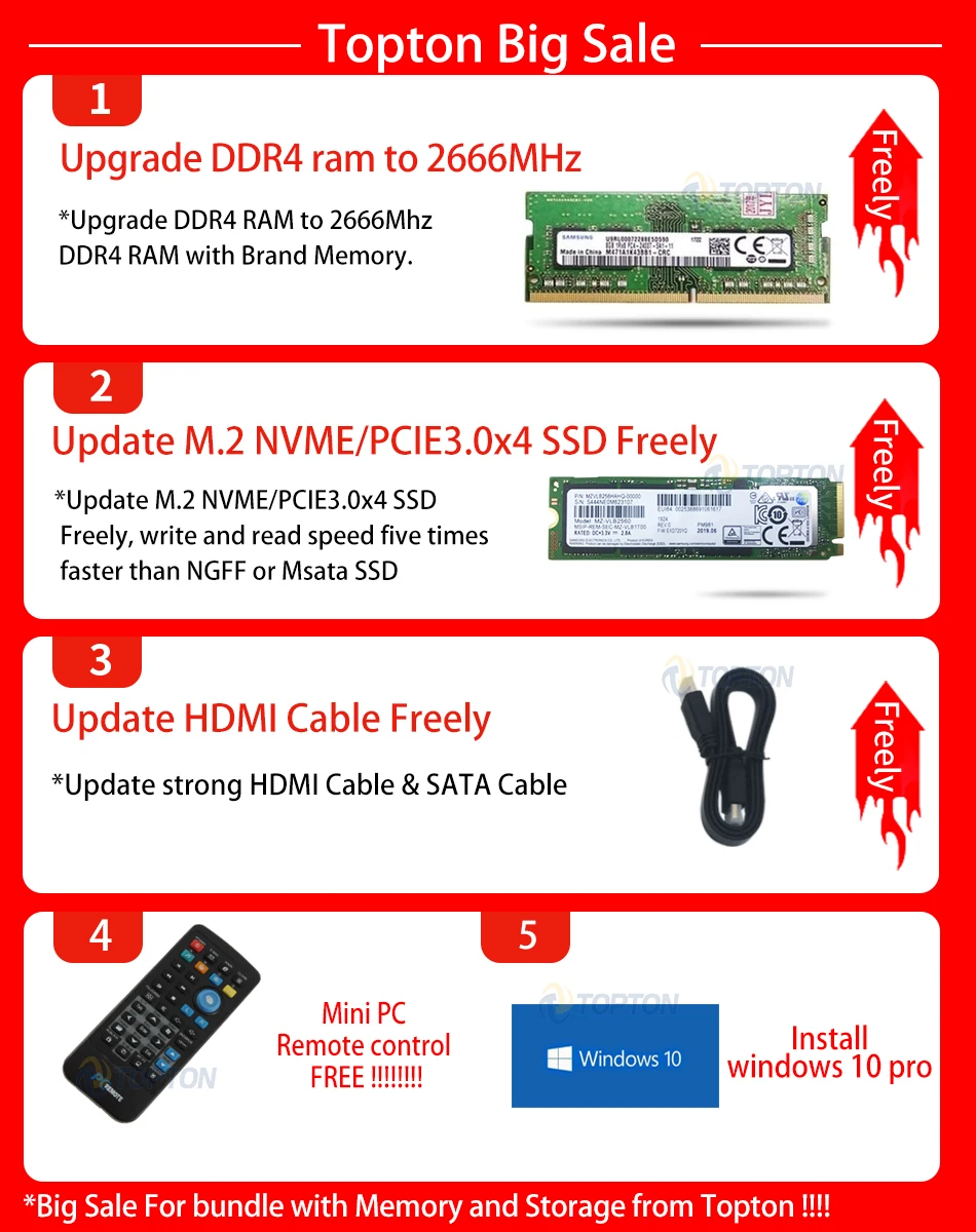 Big Sale for bundle with ram and storage: 1. FREE GIFT HDMI Cable & Mini PC remote control&OEM win10 pro pre-installed!