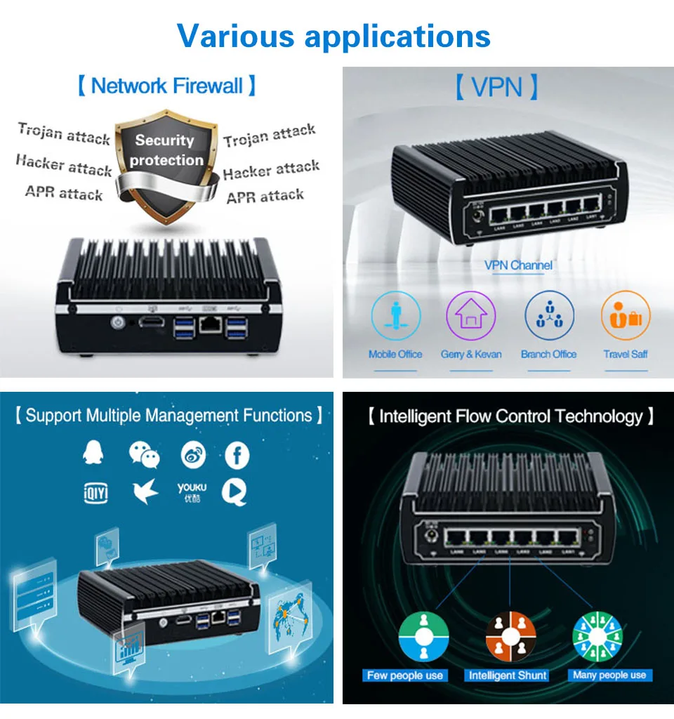 Firewall Mikrotik Pfsense VPN Network Security Appliance Router PC Intel Intel Core I3 4160,[HUNSN SA20R],(4LAN/2USB/1COM/1VGA)