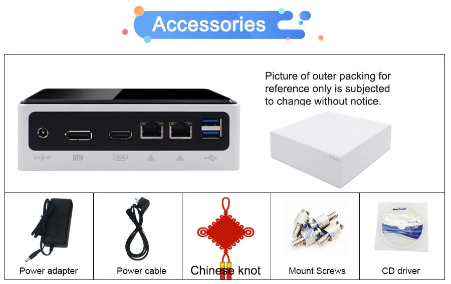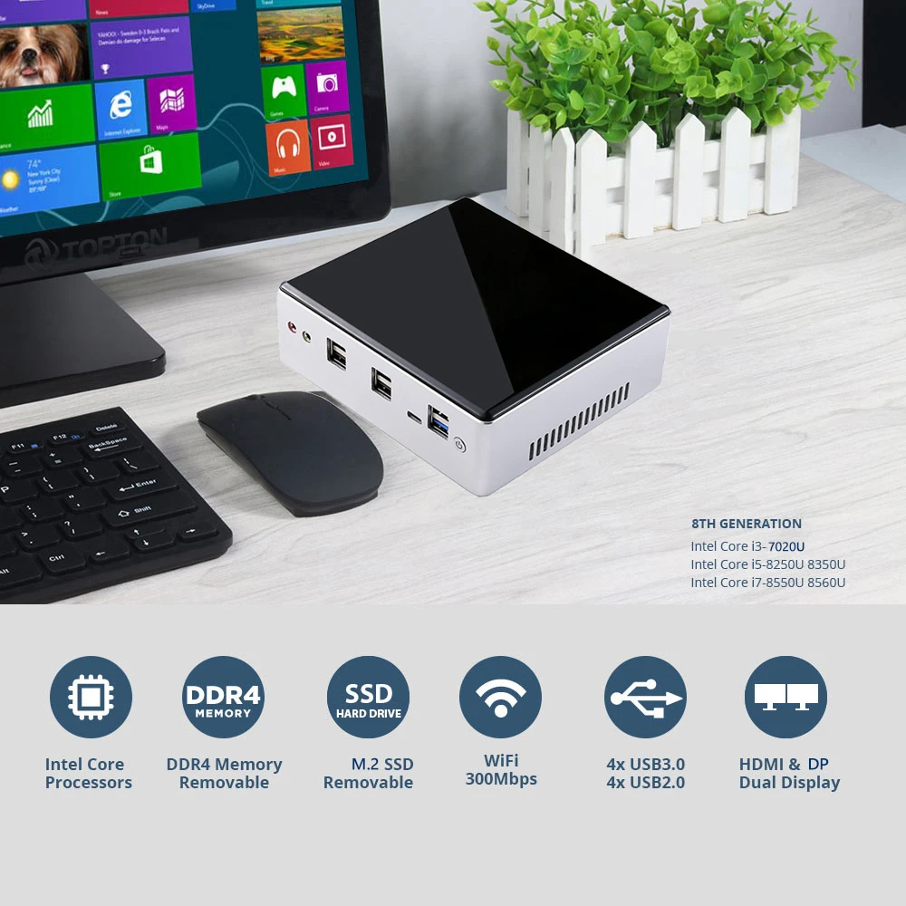 Big Sale for bundle with ram and storage: 1. Mini PC USB remote control&Chinese Knot! 2. Upgrade DDR4 ram to 2666/2400MHz free! 3. Upgrade 2.4G/5.0G dual band WiFi free! 4. Upgrade Msata SSD to fast M.2 NVME/PCIE3.0x4 SSD free! Processors parameter for referance only: Intel Core i3-7020U, 3M cache, 2.30GHz, 2 cores, 4 threads;(maybe send i3-7130U i3-7167U etc by random) Intel Core i5-8250U, 6M cache, 1.60GHz up to 3.40GHz, 4 cores, 8 threads;(maybe send i5-8259U i5-8350U etc by random) Intel Core i7-8550U, 8M cache, 1.80GHz up to 4.0GHz, 4 cores, 8 threads;(maybe send i7-8559U i7-8650U etc by random) Intel Core i7-10510U, 8M cache, 1.80GHz up to 4.9GHz, 4 cores, 8 threads.(maybe send i7-10710U etc by random) Product Highlight - Smart tiny case 137x150x50mm hold by a hand, powerful processor 8th Gen stronger performance. - 1*M.2 2280 NVMe/PCIe/SATA SSD up to 32Gbps. - Rich interfaces with USB, Type-C, SD Card, DP, HDMI, 2*LAN etc to connect with more devices. What is in the package Notice this link . Other bundles include WiFi. 2. DO NOT buy Barebone Mini PC ("No Ram No HD No WiFi" bundle) If you are NOT IT hardware technician. PC demands professional skill to assemble. We DO NOT compensate for buyer's man-made damage and faulty. 3. Price DO NOT include any destination cost like tariff, VAT, storage fee, remote dispatching fee etc. Free Operating System: Default installed our trial activated OEM windows 10 pro English for free, other languages can be selected among: Russian,Spanish,Portuguese,French,German,Arabic,Italian,Japanese,Turkish,Greek etc. Please inform us which language you want to install. Other systems we can install free are like Linux, Ubuntu, Openelec etc if you need. Seller is irresponsible and makes no compensation for trial OEM system. Accessories as Ram, SSD, HDD, we use famous brand:samsung, micron, SanDisk, toshiba, hynix, crucial, liteon, kingfast, phison etc, What brand we use depends on our test and our stock.