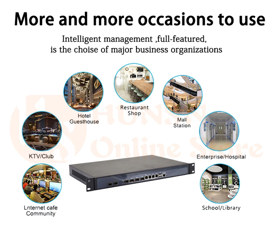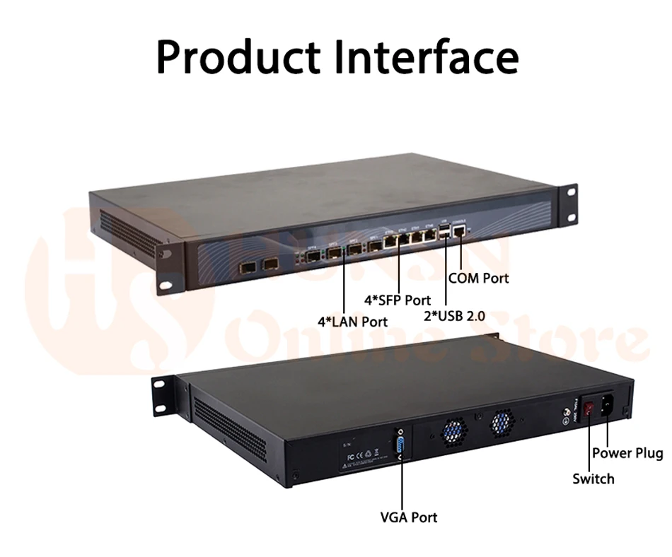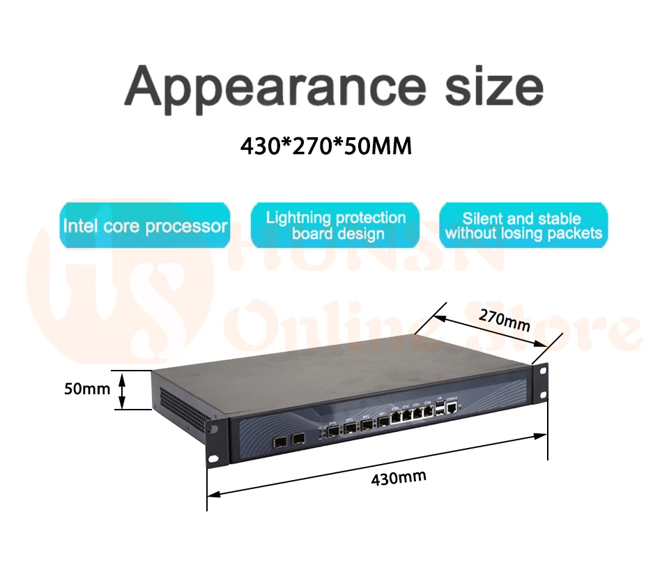 - Original industry network motherboard, low power consumption, low heat, use dedicated turbo silent cooling fan to ensure long-term operation; designed with 4 intel 82574l gigabit ,4 intel i-350 gigabit optical ports,2 intel 10 gigabit sfp 82599es,vga,2* usb; standard 1u; size at 430*270*50mm, 150w big power, with power cord; all use big brand memory and ssd/hdd with quality assurance,ready to run straight out of the box.