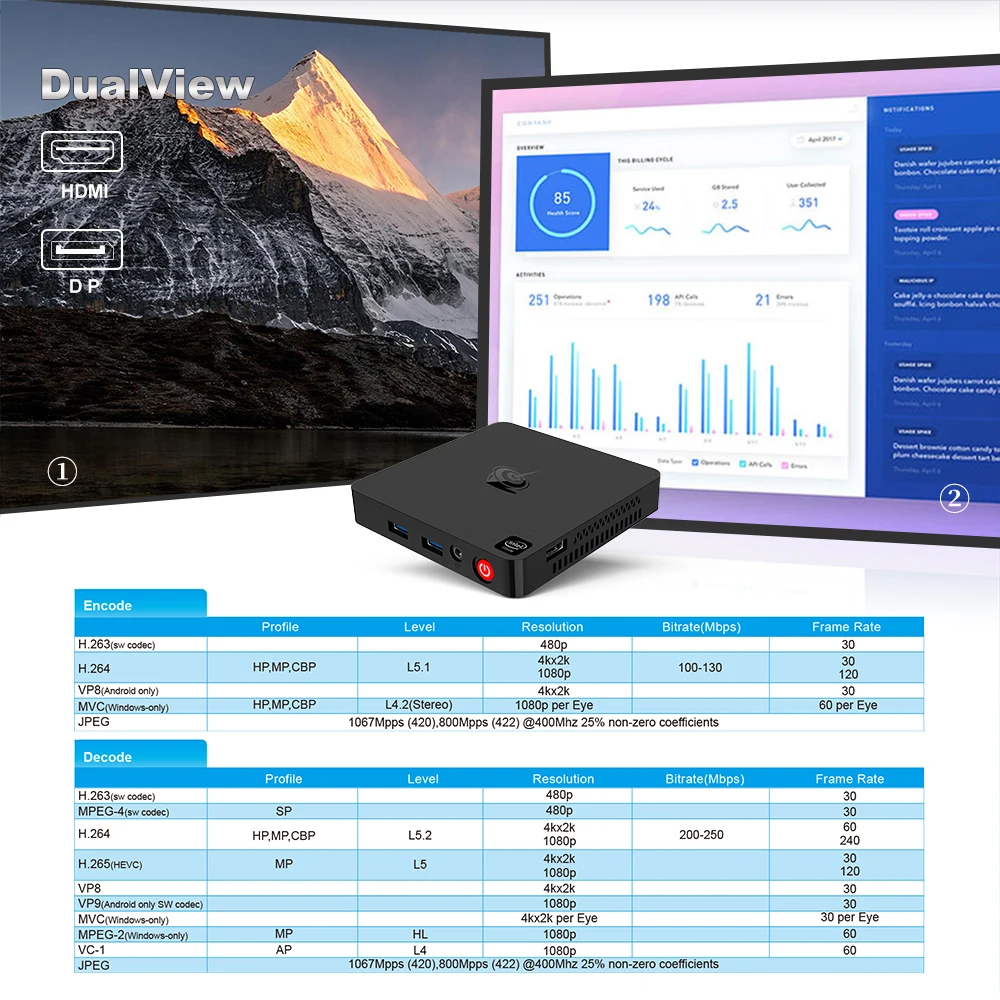 Intel Atom Z8500 Quad Core (2M Cache, up to 2.24GHz)Intel HD Graphics4GB LPDDR3 + 64GB ROMLicensed windows 104 x USB 3.0Dual Band WifiBluetooth 4.01 x RJ45 1000Mbps LANHD-MI + DP4K HTPC