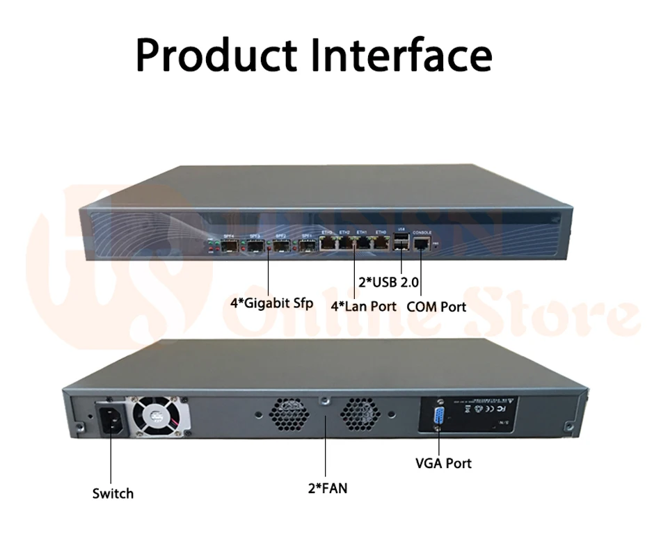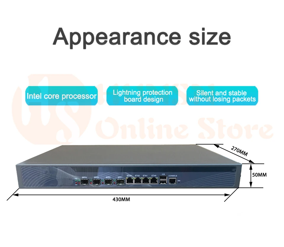 - Original industry network motherboard, low power consumption, low heat, use dedicated turbo silent cooling fan to ensure long-term operation; designed with 4 intel 82574l gigabit ,4 intel i-350 gigabit optical ports,vga,2* usb; standard 1u; size at 430*270*50mm, 150w big power, with power cord; all use big brand memory and ssd/hdd with quality assurance,ready to run straight out of the box.