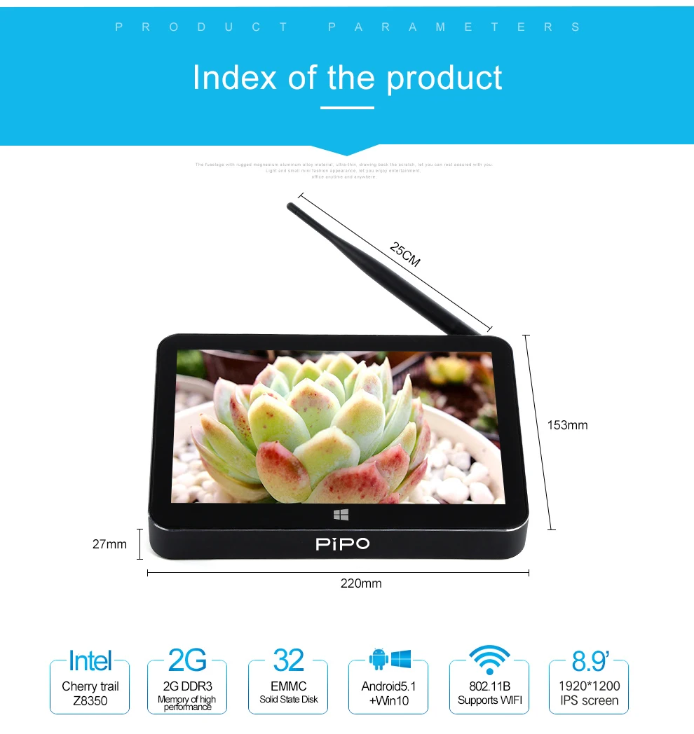 | Pipo X11 8.9 inch Mini PC Windows 10 Intel Cherry Trail Z8350 2GB Ram 32GB Rom 1920*1200 IPS Screen BT 4.0 HDMI Wifi |