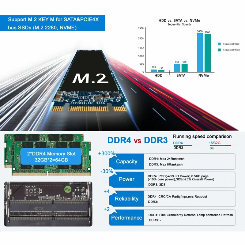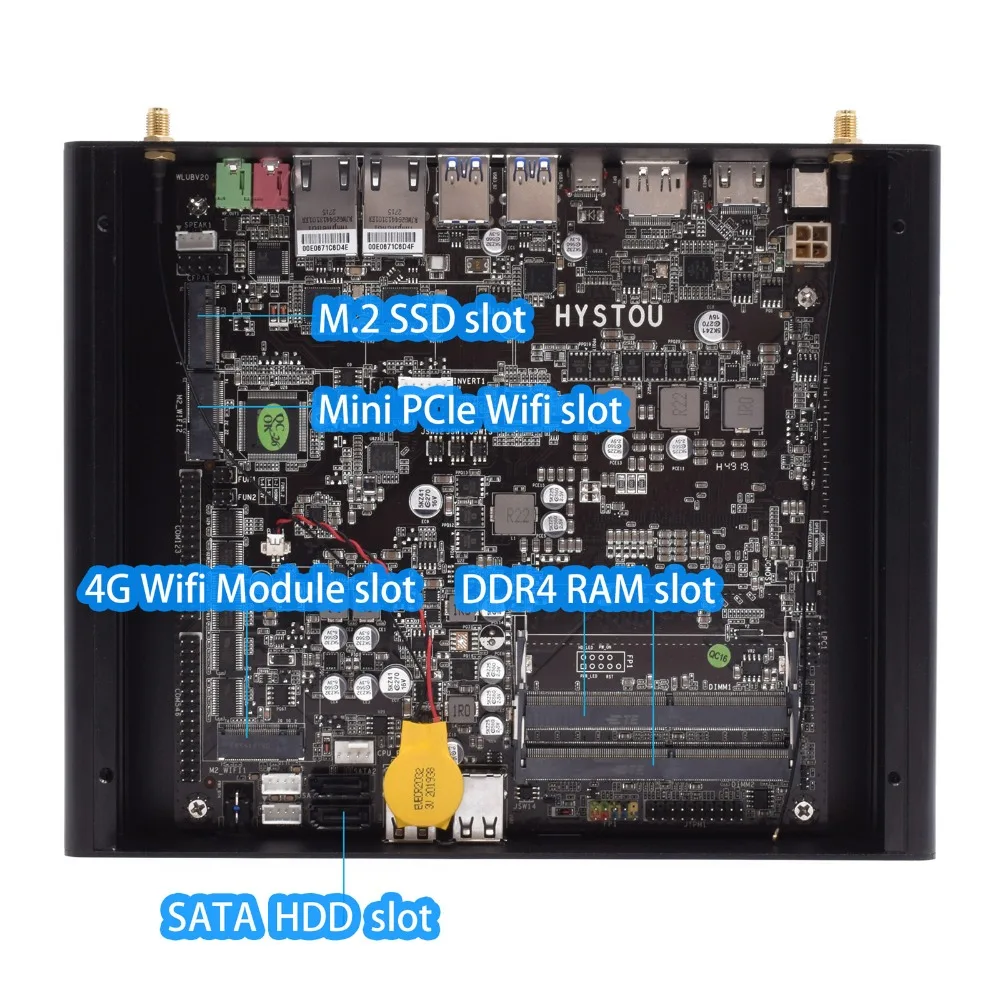 Srogages and wifi BT On-board m.2 SSD slot support NVME m.2 2240/2260/2280 SSD(default SSD from HYSTOU is 2280); 2*SATA slot for 2 pcs 2.5 inch HDD, capacity up to 5 TB available. M.2 Wi-Fi slot support all kind m.2 Wi-Fi module for wifi and bluetooth 3.0/4.0/5.0 combo, together with 2 external Wi-Fi antennas(short or long antennas same performance and ship randomly). 2*260 pin DDR4 memory slot support up to 32GB*2 equal 64GB RAM, more than enough for your regular computing requirement.