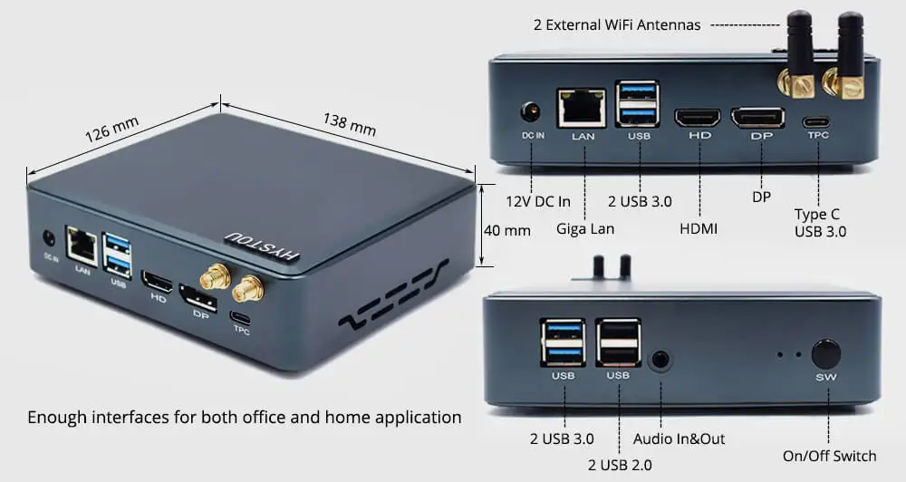 - I/O Port : 4* USB 3.0,2USB2.0,1*Type C USB3.0 1X DC power,2X RJ45 lan port,1X Headphone-out/ MIC-in phone jack