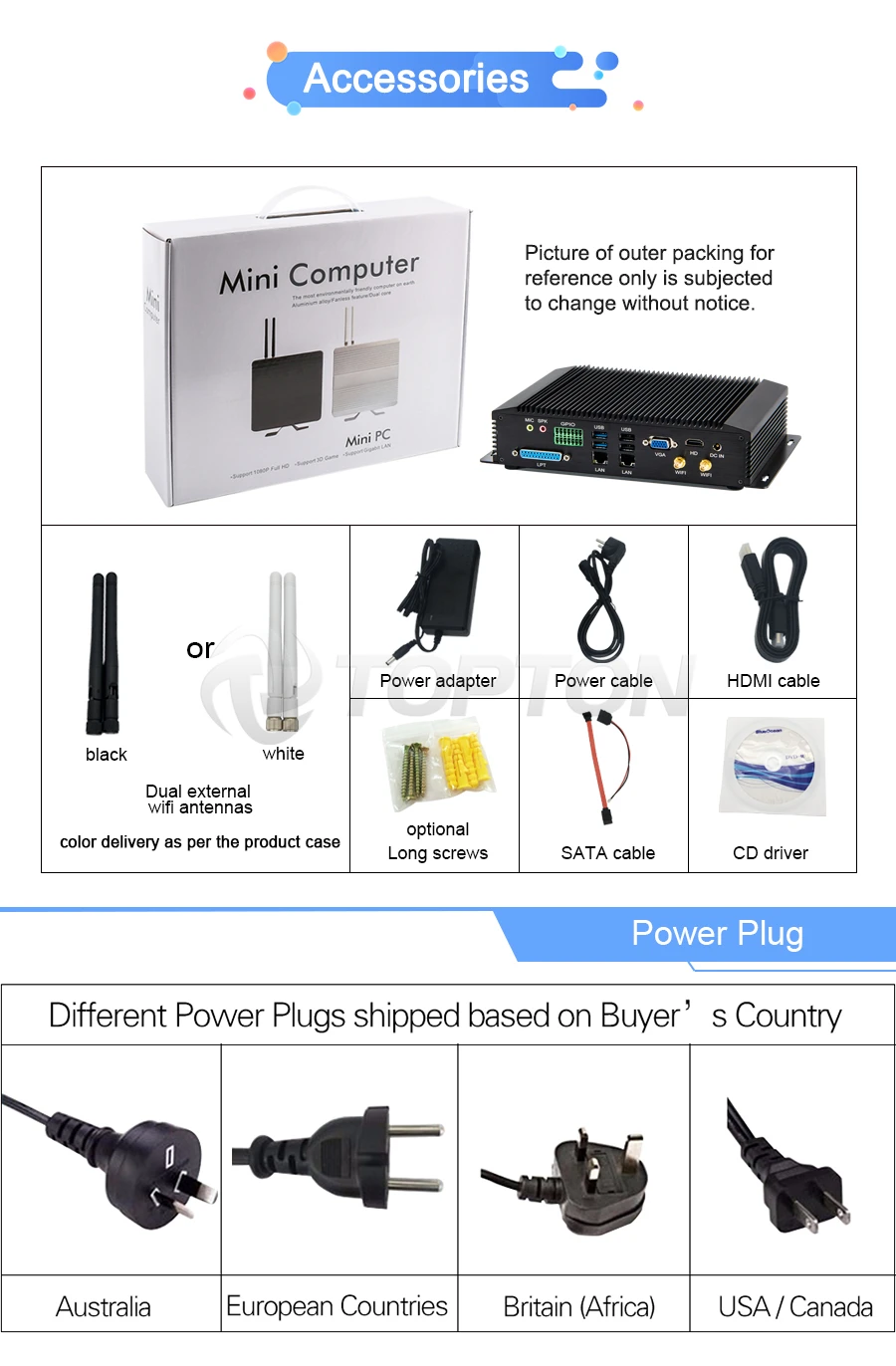 PC had best to use Samsung, SKhynix, Micron etc original brand accessories, We DO NOT compensate for buyer's own ram and hard drive. - 2xIntel i211 Gigabit RJ45 LAN and 6xCOM 232(2xCOM can change to RS422/485 from BIOS). - One embedded SIM card slot for 4G Module. - GPIO, LPT, 6COM, HDMI, VGA, USB, MIC, SPK rich ports. - Full Aluminum Alloy Black color shell, Exquisite production craft on outside design. - Fanless system without cooling fan, silent performance fit for industrial grade field, work as long as 24 hours. - Support Watchdog, Auto power on, RTC, PXE boot, Wake-on-LAN. - Low consumption TDP only 15W and can be mounted on the wall. Buy with confidence! 3 Years long warranty for fanless system! 1. 3G module add extra 50$, 4G module add extra extra 70$. Upgrading link: https://www.aliexpress.com/item/4000259902487.html (how many dollars to upgrade, pay how many pieces, US$1=1pcs, For example upgrade USB IR remote, pay 14pcs for US$14, remember to leave message noting which one you upgrade for...)