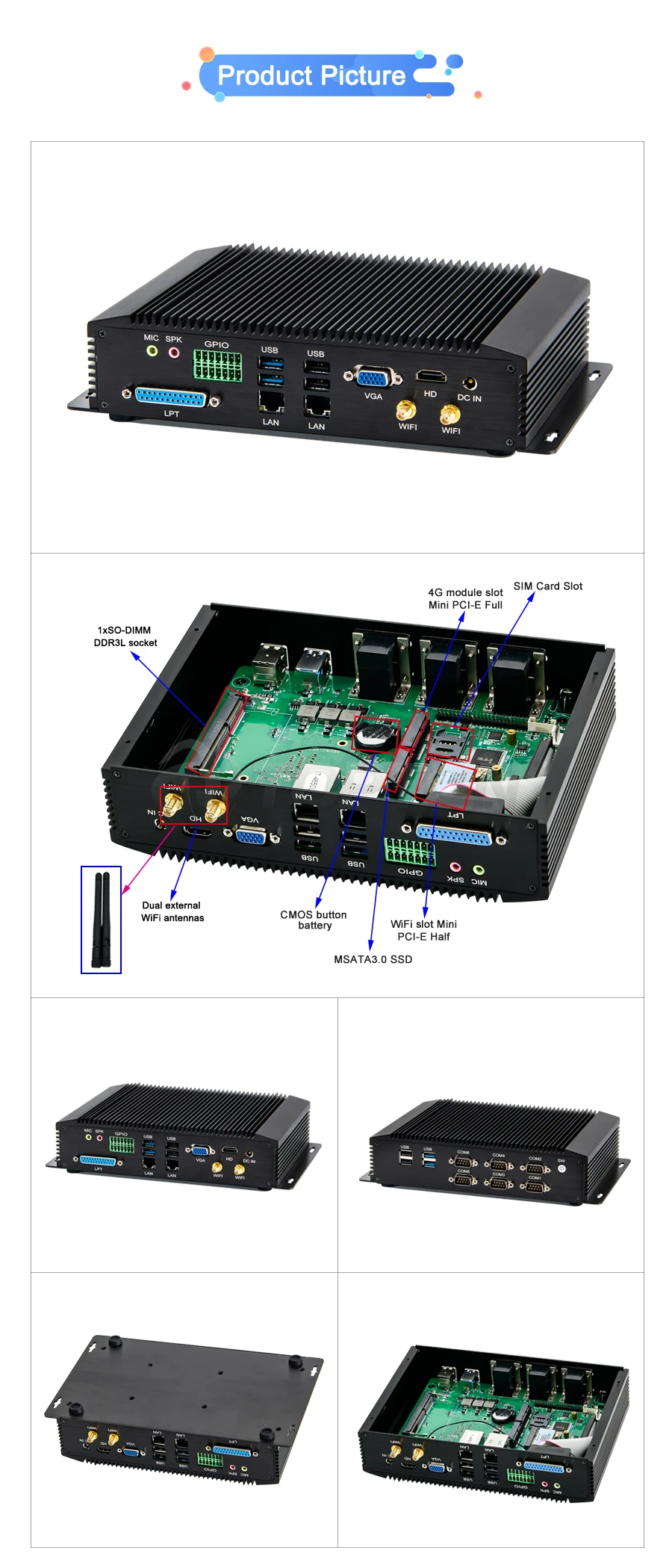 Processor parameter for referance only: 1. Skylake 14nm CPU Intel Core i3 6006U 2 cores 4 threads 2.0Ghz 3M cache TDP 15W Intel HD 520. 2. Kaby Lake 14nm CPU Intel Core i5 7200U 2 cores 4 threads 2.5Ghz Max to 3.0Ghz 3M cache TDP 15W Intel HD 620. 3. Kaby Lake R 14nm CPU Intel Core i5 8250U 4 cores 8 threads 1.6Ghz Max to 3.4Ghz 6M cache TDP 15W Intel UHD 620. 4. Kaby Lake R 14nm CPU Intel Core i7 8550U 4 cores 8 threads 1.8Ghz Max to 4.0Ghz 8M cache TDP 15W Intel UHD 620. DO NOT buy "no ram no storage" bundle if you are not Computer Expert, PC had best to use Samsung, SKhynix, Micron etc original brand accessories, We DO NOT compensate for buyer's own ram and hard drive. - 2xIntel i211 Gigabit RJ45 LAN and 6xCOM 232(2xCOM can change to RS422/485 from BIOS). - One embedded SIM card slot for 4G Module. - GPIO, LPT, 6COM, HDMI, VGA, USB, MIC, SPK rich ports. - Full Aluminum Alloy Black color shell, Exquisite production craft on outside design. - Fanless system without cooling fan, fit for industrial grade field, work as long as 24 hours. - Support Watchdog, Auto power on, RTC, PXE boot, Wake-on-LAN. - Low consumption TDP only 15W and can be mounted on the wall. Buy with confidence! 3 Years long warranty for fanless system! 1. 3G module add extra 50$, 4G module add extra extra 70$. Upgrading link: https://www.aliexpress.com/item/4000259902487.html (how many dollars to upgrade, pay how many pieces, US$1=1pcs, For example upgrade USB IR remote, pay 14pcs for US$14, remember to leave message noting which one you upgrade for...)