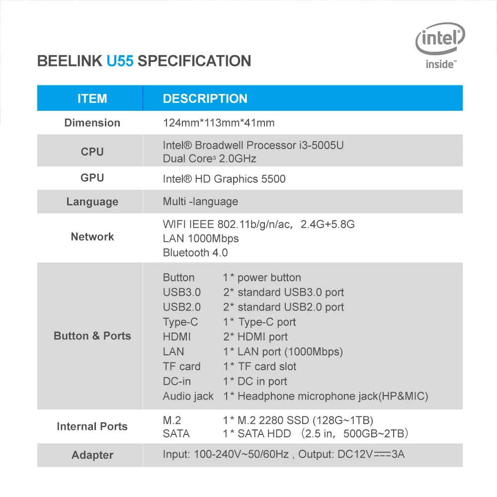 | Beelink U55 Intel Broadwell i3-5005U Mini PC Windows 10 8GB DDR3L 128GB 256GB 512GB SSD Gaming PC Dual HD i3 Mini Computer |