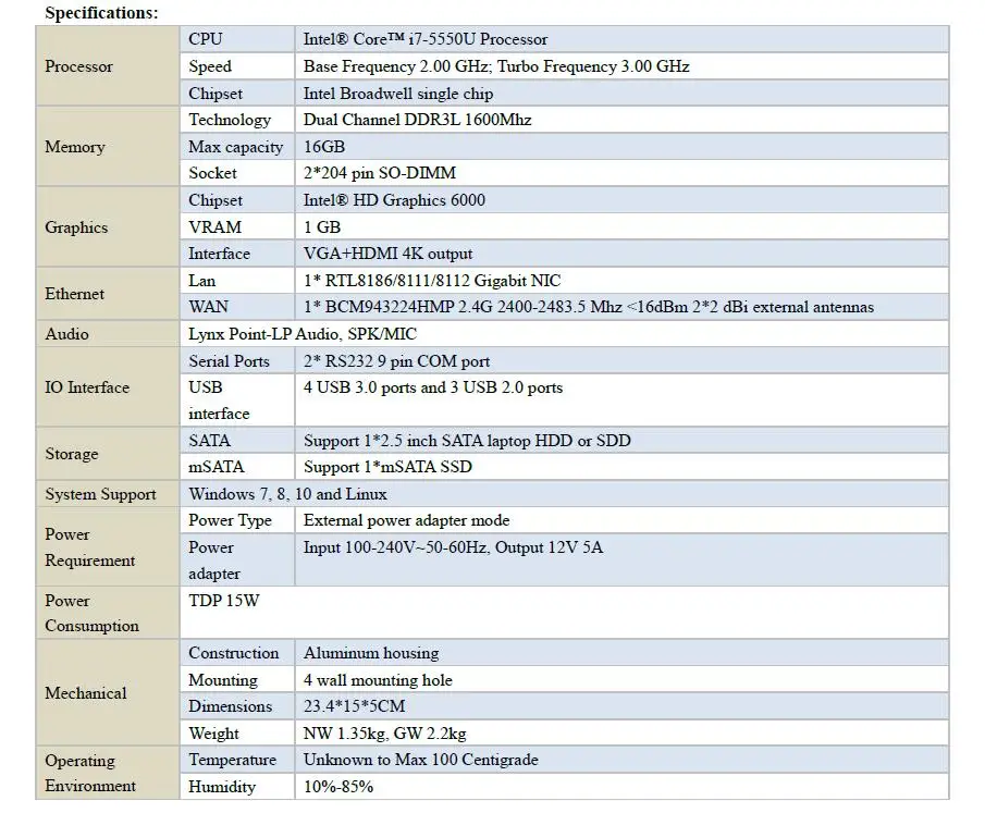 1.Core Technique: Intel Core i5 4200U(i5 5250U)+Fanless professional passive cooling by alloy case, be able to work 24hours per day,Dual band wifi 2.4G 5G,(Bluetooth is optional) 2.Intel HD Graphics: High-end Intel Graphics HD 4000, fight again dedicated Graphics!4K Ultra HD streams,1*VGA &1*HDMI dual monitor display 3.Storage: barebone system means no memory and no hard disk on the motherboard, you can only use it after installing only 1.35V Low Voltage SO-DIMM DDR3L laptop memory and mSATA 3.0 SSD or 2.5 inch SATA3 HDD on the motherboard 4.Widely used: Work with any brand monitors; 1*RJ45 Gigabit Lan Nic+1*VGA+1*HDMI+4*USB3.0+3*USB2.0+2 RS232 COM Suit for multiple application for example integrate with touch devices, industries, car repair shops, security, education, home as HTPC, business, fanancial and projects 5.Features: Fanless Mini-PC just use its Aluminum alloy case to dissipate the heat to the air to avoid over heating. Paired the Fanless Mini-PC computer with Solid State Hard Disk(SSD) will make the computer with zero noise, space saving, low power Consumption, and trouble free for your project. 6.Operate System:Support almost all Windows and Linux OS, default OS we preinstall is Cracked Windows 10 English version, (not genuine but works good), genuine windows add extra US $35,Support multi-languages: Russian, Spanish, Portuguese, French, German, Arabic, Italian, Japanese, Turkish, Greek etc. Leave message if you have special requirement for OS 7. Power Adapter : The power Plugs will be sent base on buyer's country. So no worry about it.